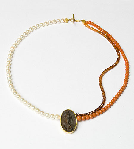 Collier, Eisengemme, Perlen, Korallen, Hessonit
