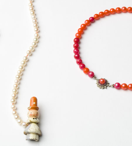 Perlketten mit Fundstück und Eisen mit Nagellack lackiert, Weißgoldschloss mit Rubinen